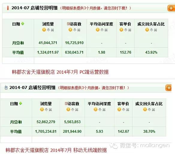 半仙:问得好,在看数据。下图韩都衣舍2014年7月天猫店铺PC端、移动无线端数据。可以看出无线端正在接近PC端,这就是机会哦。