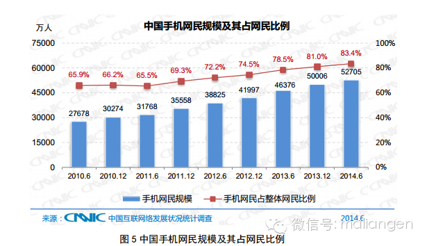 半仙:此言差矣,为什么呢?做生意讲究时势。时,截至目前中国手机用户5.27亿。势,雷军说过,站在风口,猪也能飞。现在很多电商未必看好手机电商。所以你在这个最佳风口进入,势必会有好的开端。来一组数据。下面是2014年6月中国手机网民规模及其占网民比例。韦爵爷可以看看手机发展势头是不是很猛。