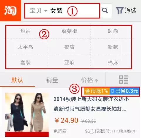 宝贝结果搜索页展示。①搜索词下拉框。②宝贝属性,用户可以根据提示找到自己想要的商品.③淘金币和手机专享价。这2个功能是手机淘宝搜索权重较重要的2个,所以想排在前面必须设置哦。